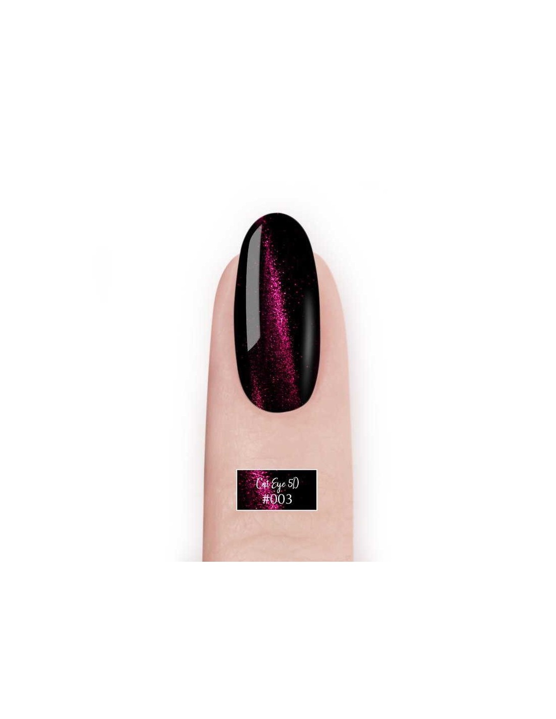 Cat Eye 5D # 003 is a magnetic hybrid in the colour of ripe cherry with maroon cat eye. Thanks to micro-cups of metal contained in the formula, a dedicated magnet is enough to attract metallic dust and create luminous, shimmering patterns resembling a cat's eye. The Cat Eye magnet should be applied approximately 5 mm away from the painted nail. Cat Eye 5D # 003 requires a base in the form of a different colour (we recommend black) because it is semi-transparent.
