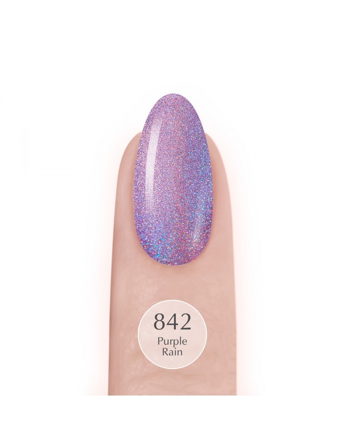 842 Purple Rain looks like a cascade rain, glowing with various colours in the sunshine. It is a cool purple with a million of glowing, holographic particles, that is perfect for spring and autumns stylings.