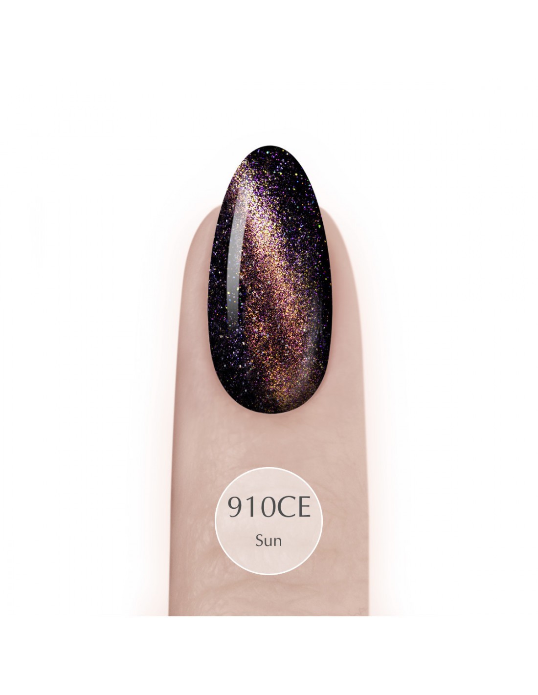 910CE Sun is a gel polish with a Cat Eye effect that gives a cosmic glow from a combination of shades: yellow, pink and purple.