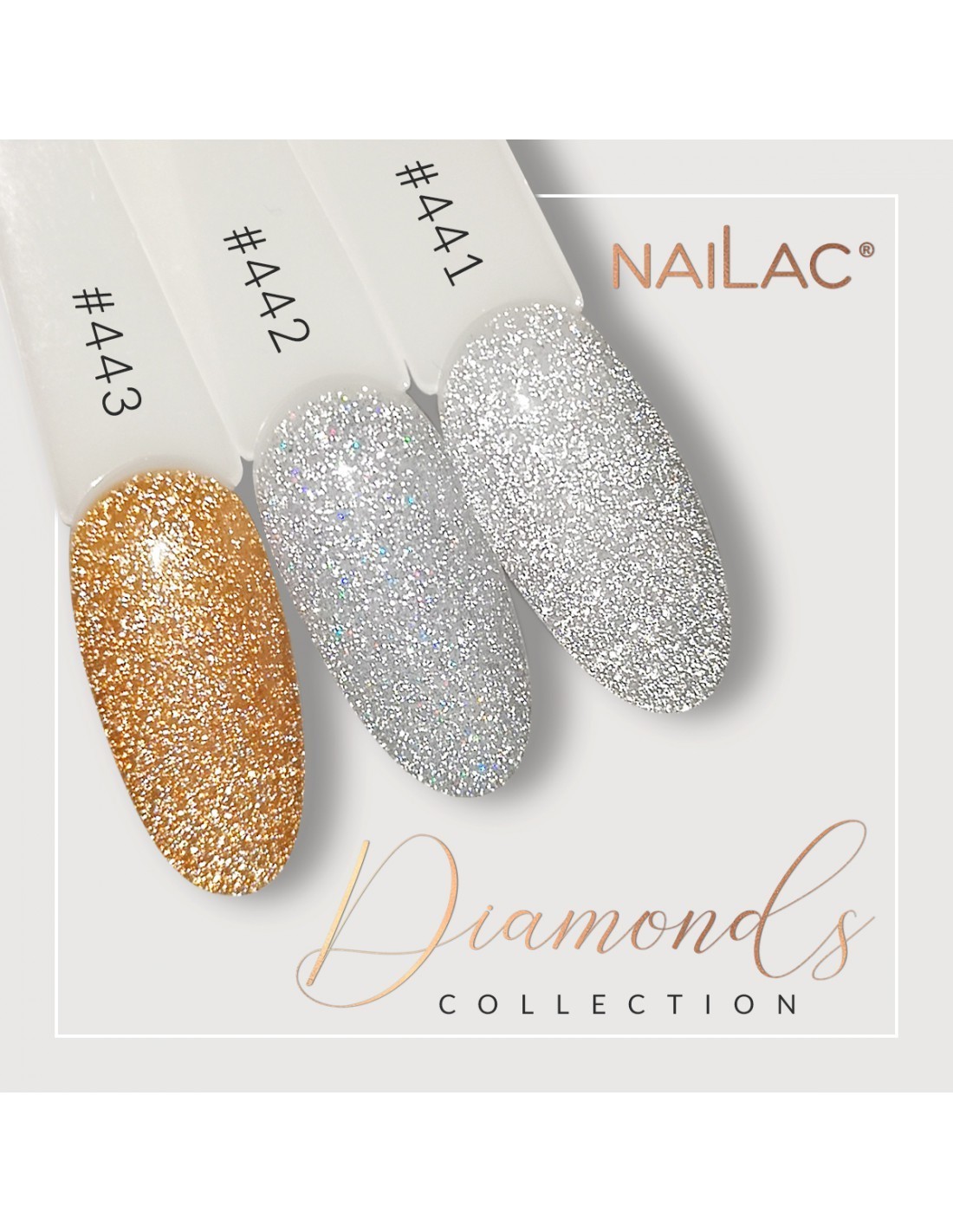 Gel polish with the effect of a crushed diamond #442 NaiLac is a gold surface that shimmers like the most beautiful jewel. Gold particles, put on the entire nail, will give your nails an amazing character - delight with your new mani made with the new crushed diamond effect from NaiLac!