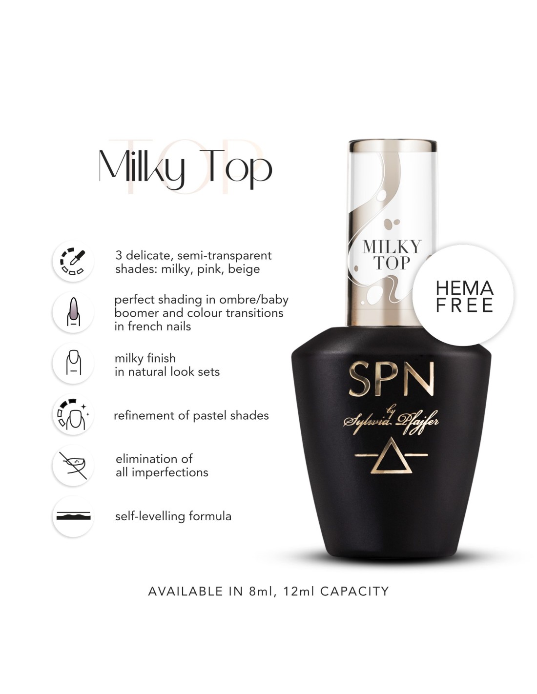Subtle and delicate TOP in the colour of a watered milk. Shade dedicated to finishing ombre, french and princess look. Thanks to the delicate, milky coverage, it beautifully smoothes the lines of shading and minor imperfections. It covers with a delicate mist and makes the sets perfectly pastel. It will look great solo as a gel manicure finish with JellyX.