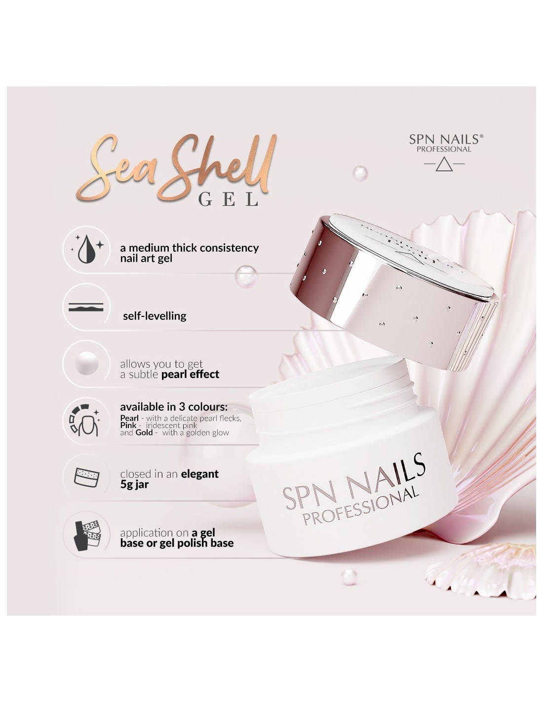 On a degreased nail plate, apply a base gel or uv gel polish base. Cure in a UV or UV/LED lamp, then apply Seashell Gel with a gel brush and cure in the lamp for 60 sec. You can also apply 700 Top Shine UV LaQ or 501 Top UV LaQ.